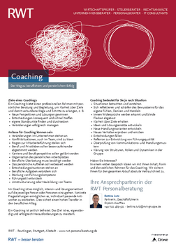 Wir bieten alle Seminar- und Trainingsthemen auch als Einzelcoaching an. Weitere Informationen finden Sie in unserer RWT Information Coaching.